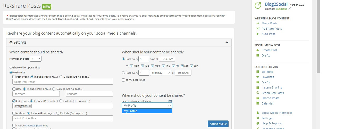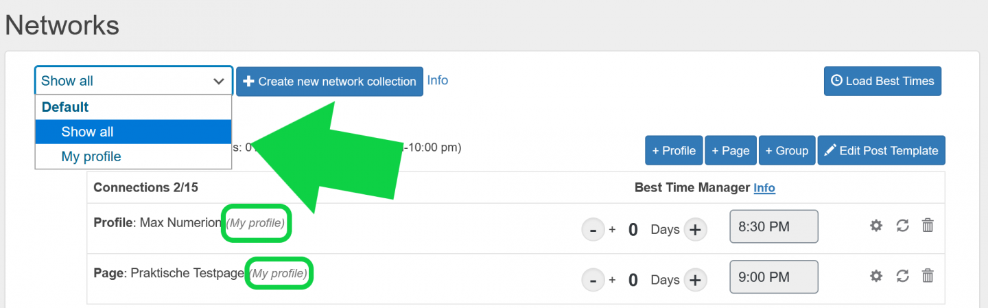 As you already mentioned the network collection “My Profile” contains multiple of your networks. You can check which networks you saved for “My Profile” when clicking on networks in Blog2Social. Here you can select “Show All” or “My Profile”.