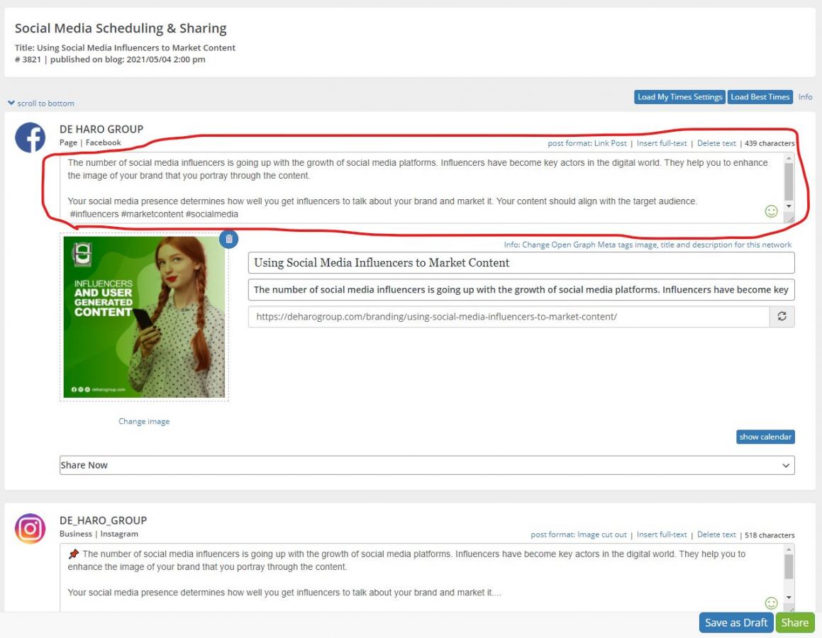 So we were really excited about trying this but now we're facing an issue that's quite frustrating. So Facebook and LinkedIn are not using the template we saved in the Networks page. We tried, resetting to default, re-inserting the settings, also disabling and enabling the plugin, cache and varnish flush. Nothing works. When we are on the Social Media Scheduling and Sharing page, to manually push one of our posts from the past that was not on our social media, the template from Facebook and LinkedIn are not how we designed it. Please look at the screenshots attached.