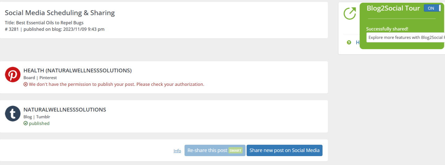 As you can see from the subject line, I can't post to Pinterest. I have suddenly started receiving an erro message, "We don't have the permission to publish your post. Please check your authorization."