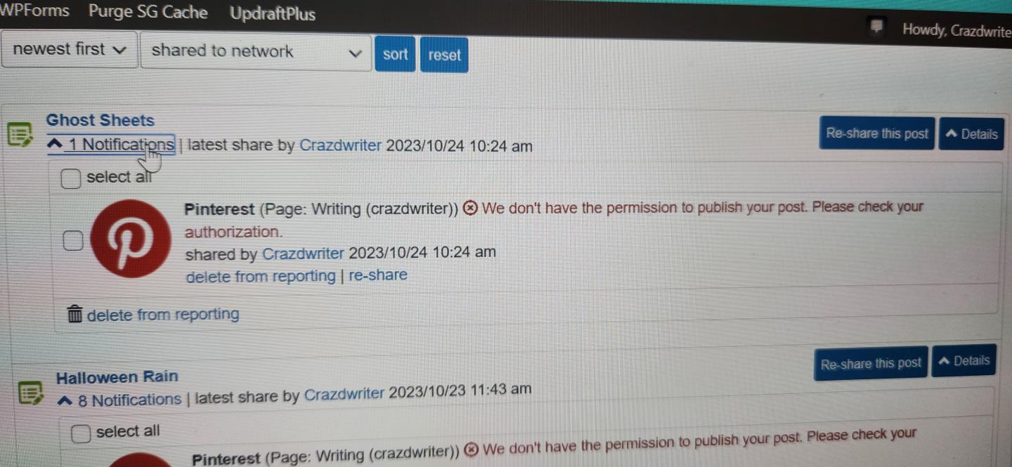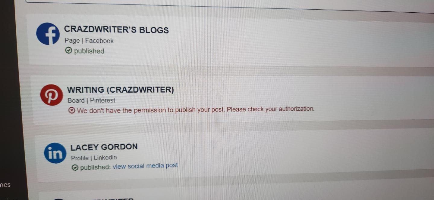 Hello,Originally posted by Crazdwriter View PostI was able to get mine back but now even though I have given authorization to Pinterest to post my blog, it will not allow me saying that your company doesn't have authorization. I have deleted and reinstated Pinterest 5 times now and it still won't allow me to post. It's very frustrating.
